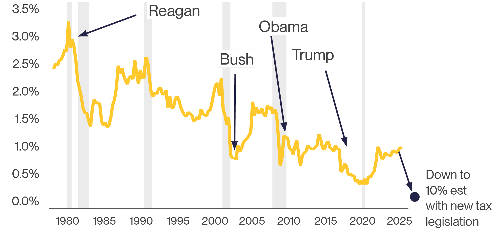 - Government policy: The domestic policy bill passed by Congress this summer is designed to push corporate tax rates down to historically low levels (see Exhibit 4), providing a boost to corporate profits going forward. Additionally, continued deregulation efforts by the Trump administration could benefit businesses’ top and bottom-line growth.
