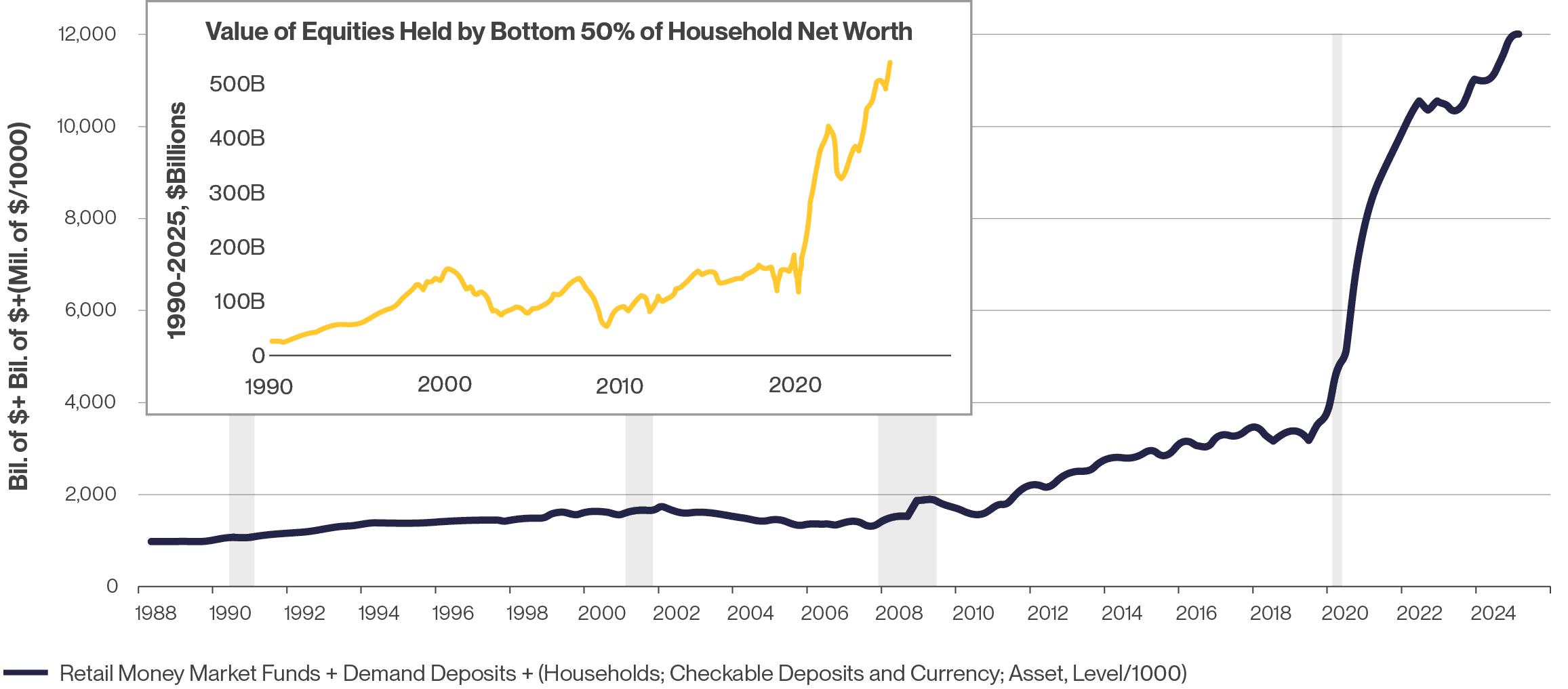 - Stronger consumer spending: Despite the falling consumer confidence noted above, the fact remains that consumers across wealth levels continue to be flush with liquidity and potential spending or investing power. Exhibit 5 shows that consumer assets held in money market funds and deposit accounts recently hit an all-time high, as did the value of equities held by households in the bottom 50% of net worth. Any number of developments, lower interest rates or greater trade policy clarity, for example, could prompt consumers to deploy that money into the economy, the financial markets, or both.