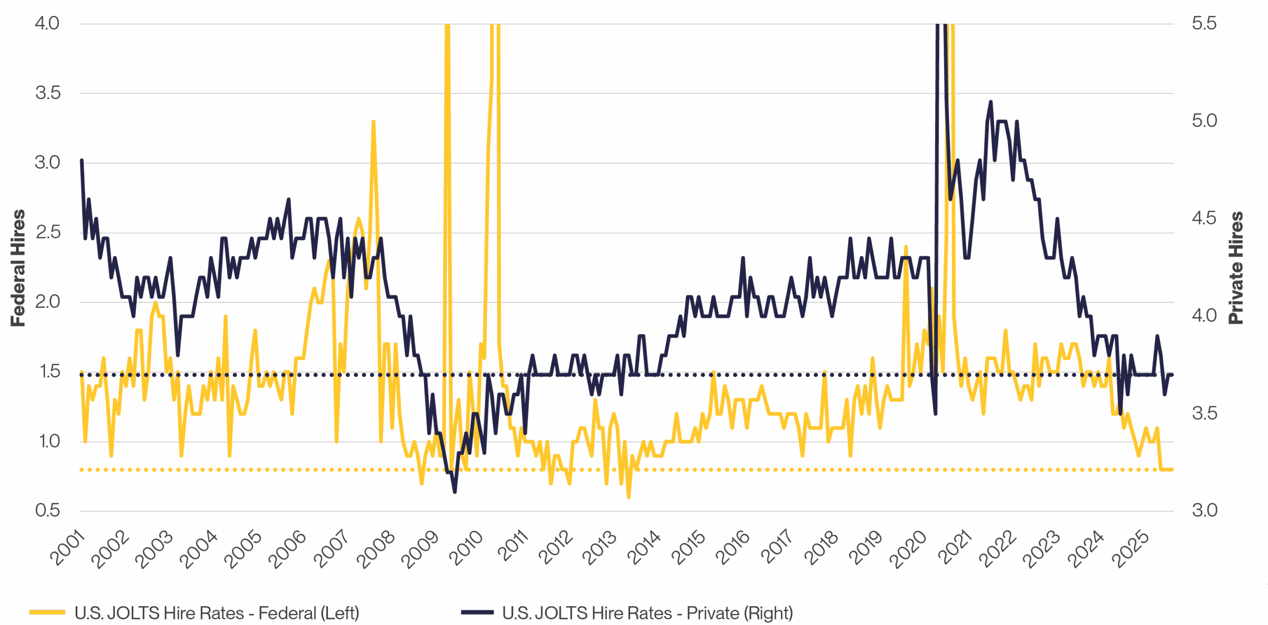 In a muddle-through scenario, we’d anticipate a continuation of mixed data signals, particularly focused on a cooling labor market and a strong U.S. consumer. For example, hiring momentum has slowed – as we saw in August, the economy added only 22,000 new jobs, falling short of the anticipated 76,500. The hiring rate among private companies is also hovering near historically low levels (see Exhibit 1).