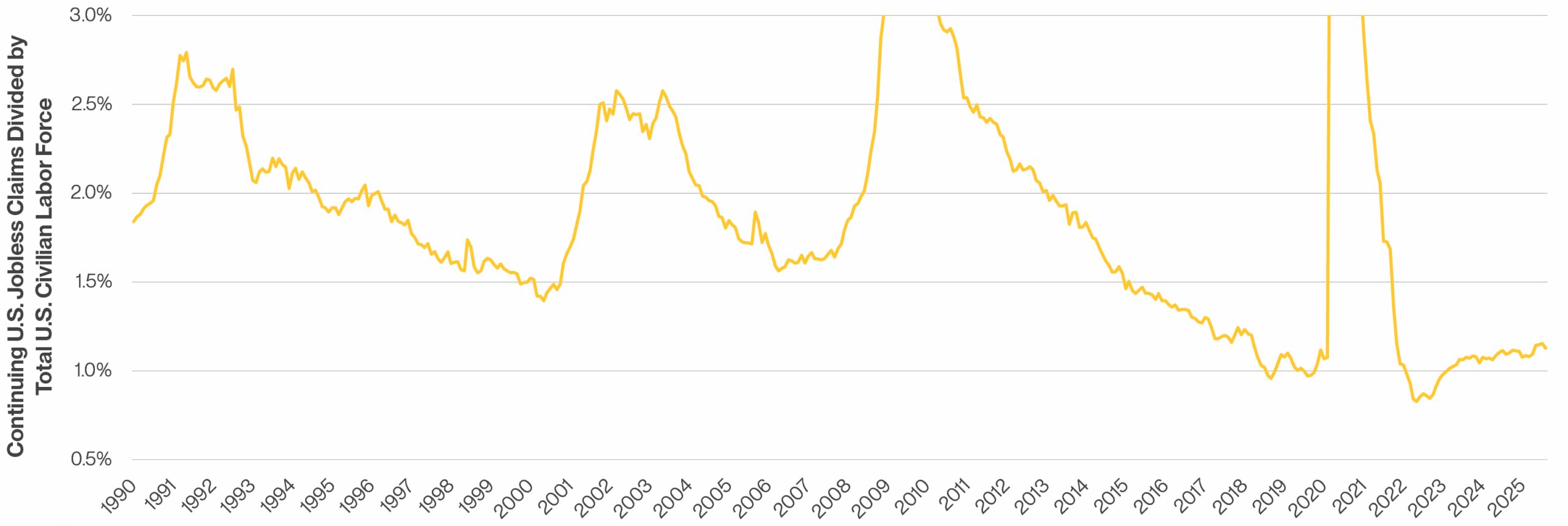 - Long-term unemployment is low: Although the labor market has somewhat weakened, it’s done so from a position of historic strength. Exhibit 2 shows that the share of the U.S. labor force experiencing ongoing unemployment remains near the record lows of 2022 and 2023.