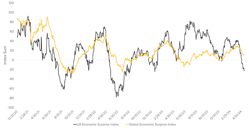 - The U.S. surprise index has fallen sharply into negative territory (-23), reflecting that economic data here at home has largely been weaker than expected lately.